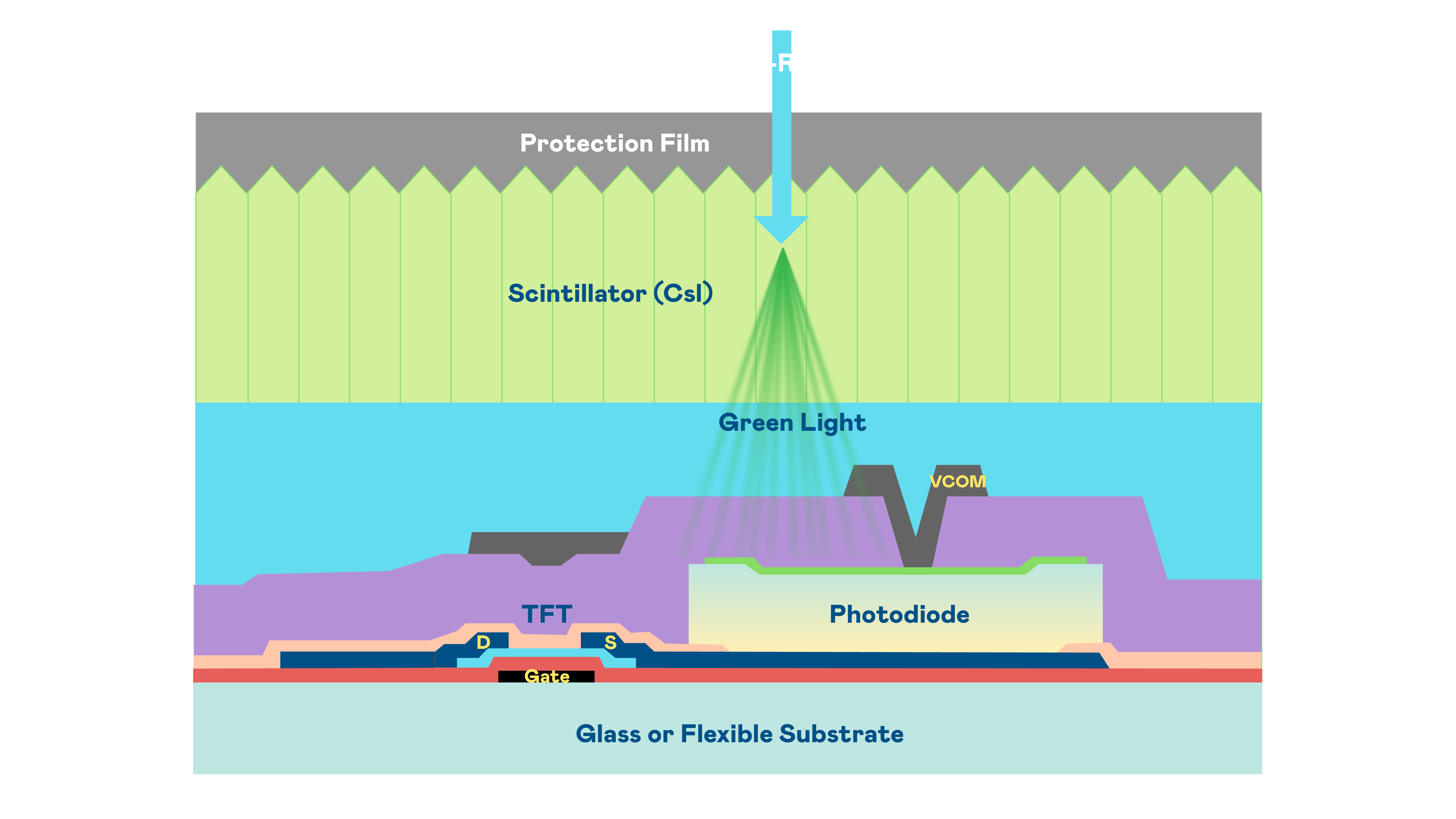 918搏天堂的X光影像感测阵列使用薄膜电晶体 (TFT) 作为每个像素的读取开关,搭配光电二极体(Photodiode)的光电转换元件,用以感测X光影像讯号。